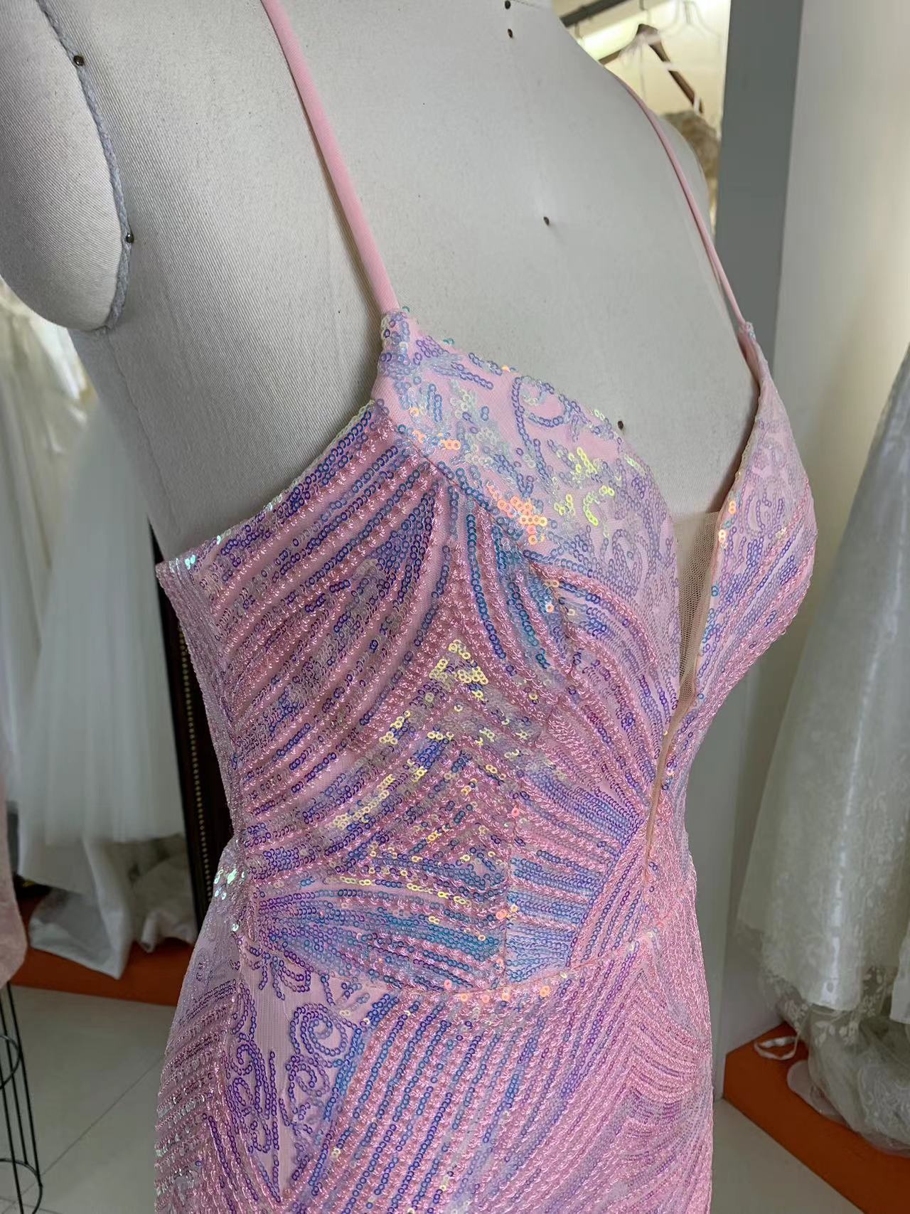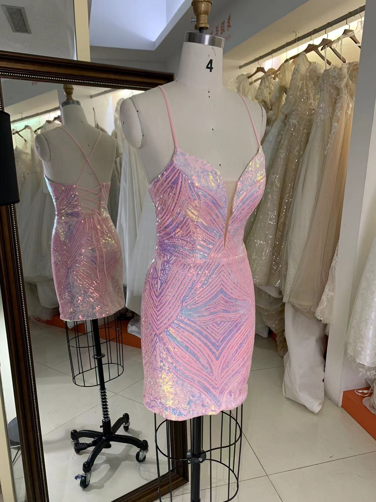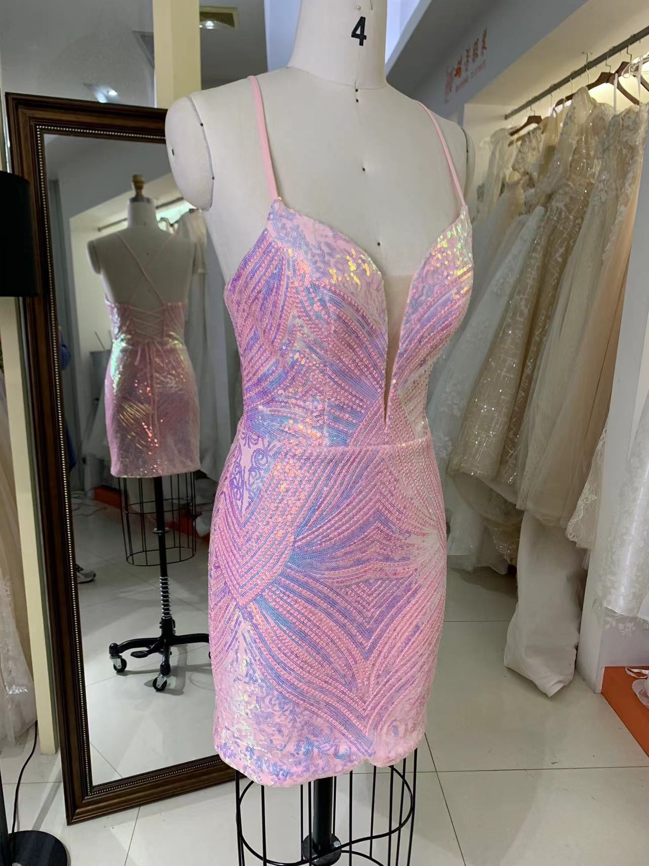 Home > Sell > Lace Up Back Sleeveless Spaghetti Strap Knee Length Deep V Neck Homecoming Dress