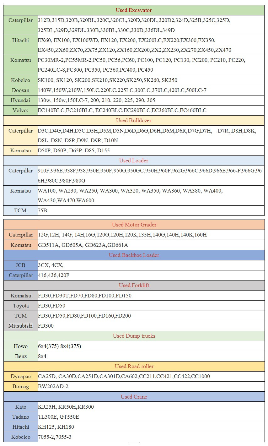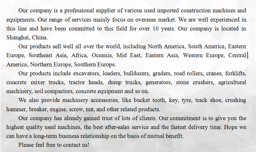 Our company specialized in export all kinds of the used construction machine.We have established good business relationship with many countries from all over the world such as Africa, Middle East, Saudi Arabic, West Asia, South East and so on.We supply used excavators ,used bulldozers,used loaders,used cranes ,used forklifts,used dumpers,used road graders,used road rollers.Many famous brand for your choice such asUsed Excavators: Caterpillar, Komatsu, Hitachi, Kobelco, Sumitomo, Hyundai, Volvo, Daewoo, Doosan.Used Bulldozers: Caterpillar, Komatsu, Shantui.Used Loaders: Caterpillar, Komatsu, Kawasski, Xgma, Lonking, SDLG.Used Cranes: Liebherr, Demag, Grove, Krupp, Kato, Tadano, Kobelco, Zoomlion, Xgma.Used Motor Graders: Caterpillar, Komatsu.Used Road Rollers: Caterpillar, Dynapac, Bomag.Used Forklifts: TCM, Toyota, Komatsu. Used Dump Trucks: Komatsu, Camc.Under the direction of our long-term enterprise faith of "Quality and Reputation come First ", we believe we can reach the win-win status with our clients. You are most welcome to become one of our dearest partners in the nearest future.