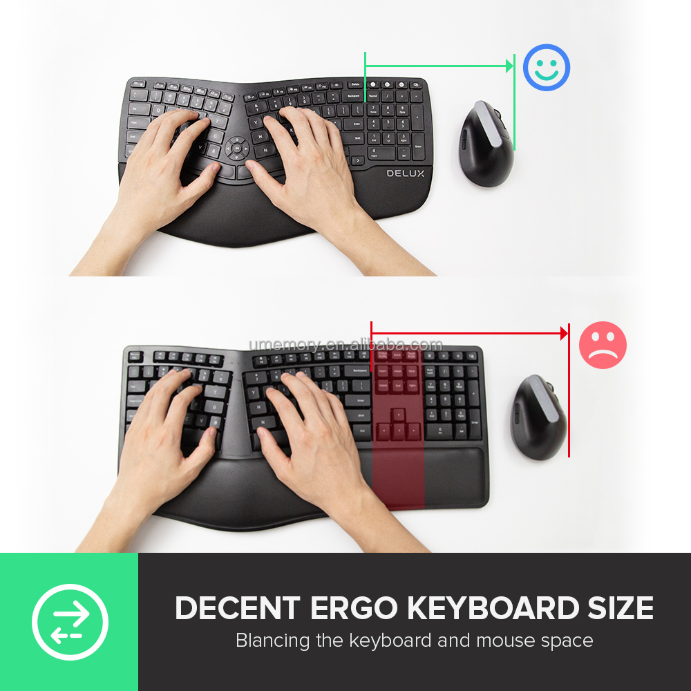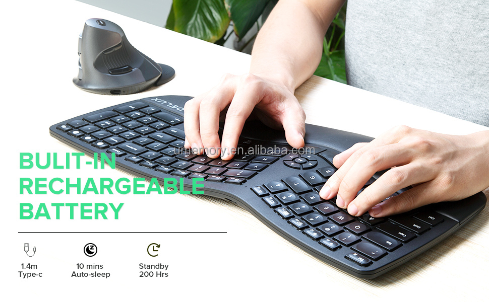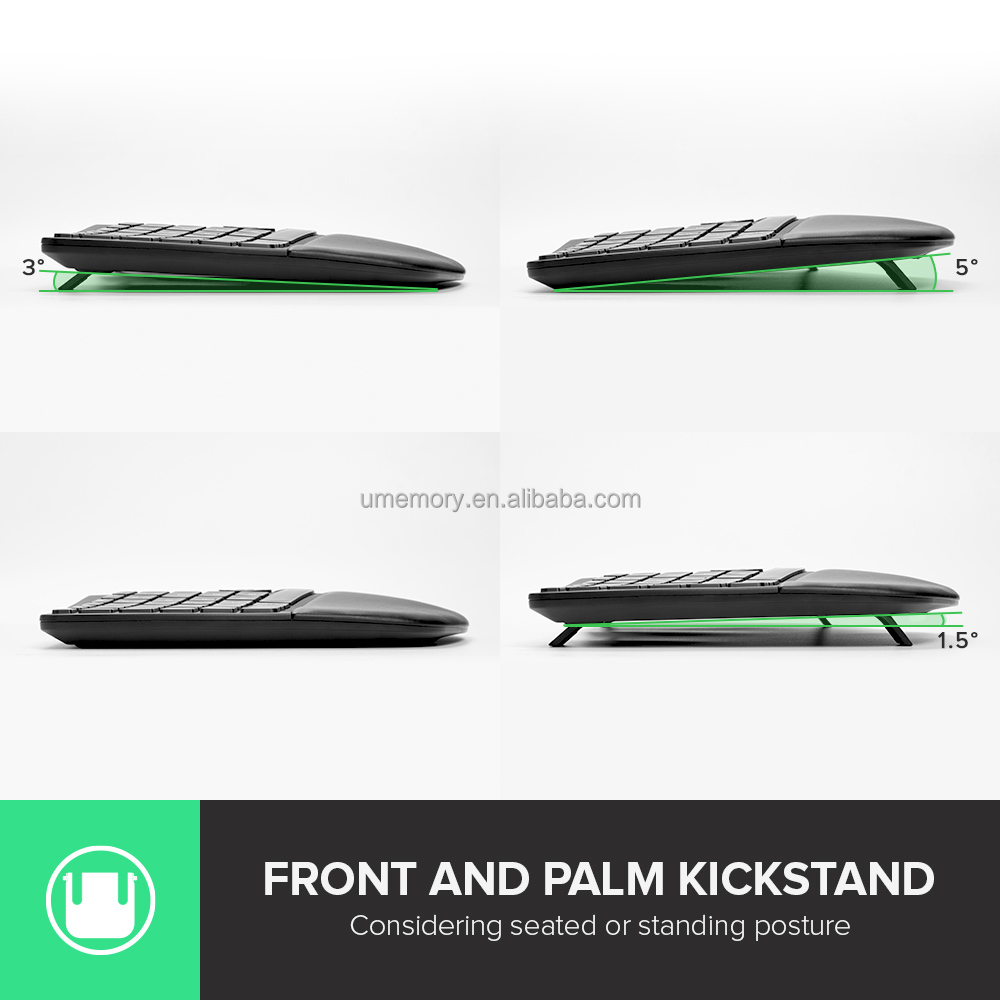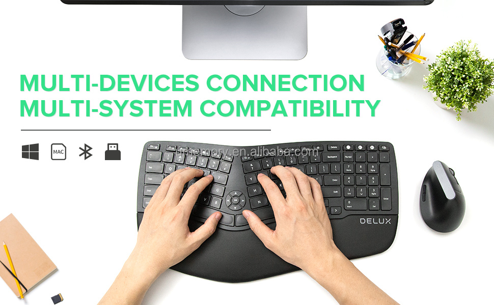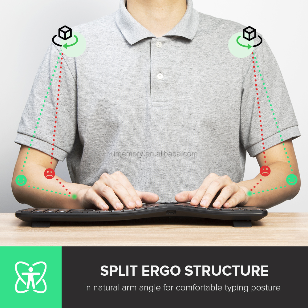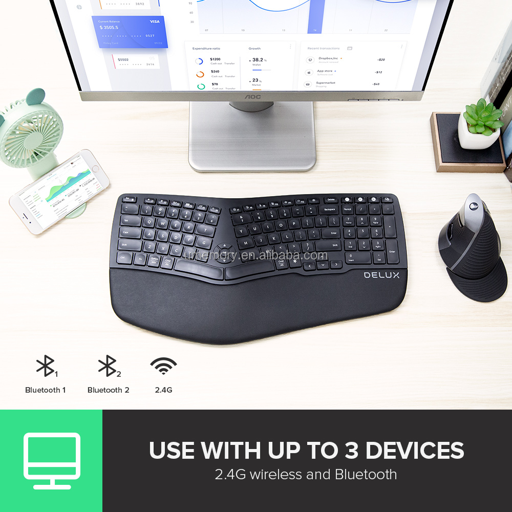 1. Curved and Split Ergonomic Keyboard Structure for Natural Typing Posture. 2. Multi devices connection] with 2.4G wireless(come with USB receiver) and Bluetooth 5.0 with 2 channel(BT1+BT2), use with up to 3 devices.