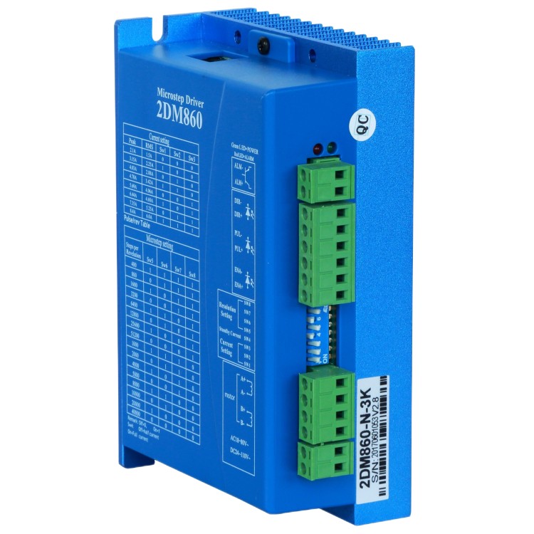 2DM860 is newest digital stepper motor driver launched by XinYuhai, using the latest 32-bit DSP control technology, the user can set any segment within 25600 and multi-range current value within rated current,with built-in micro technology,2DM860 driver greatly improved stability and reduced noise under subdivision. Integrating automatic parameter tuning function inside.it also can adjust the optimal operation parameters automatically for different motors to maximize the performance of the motor.