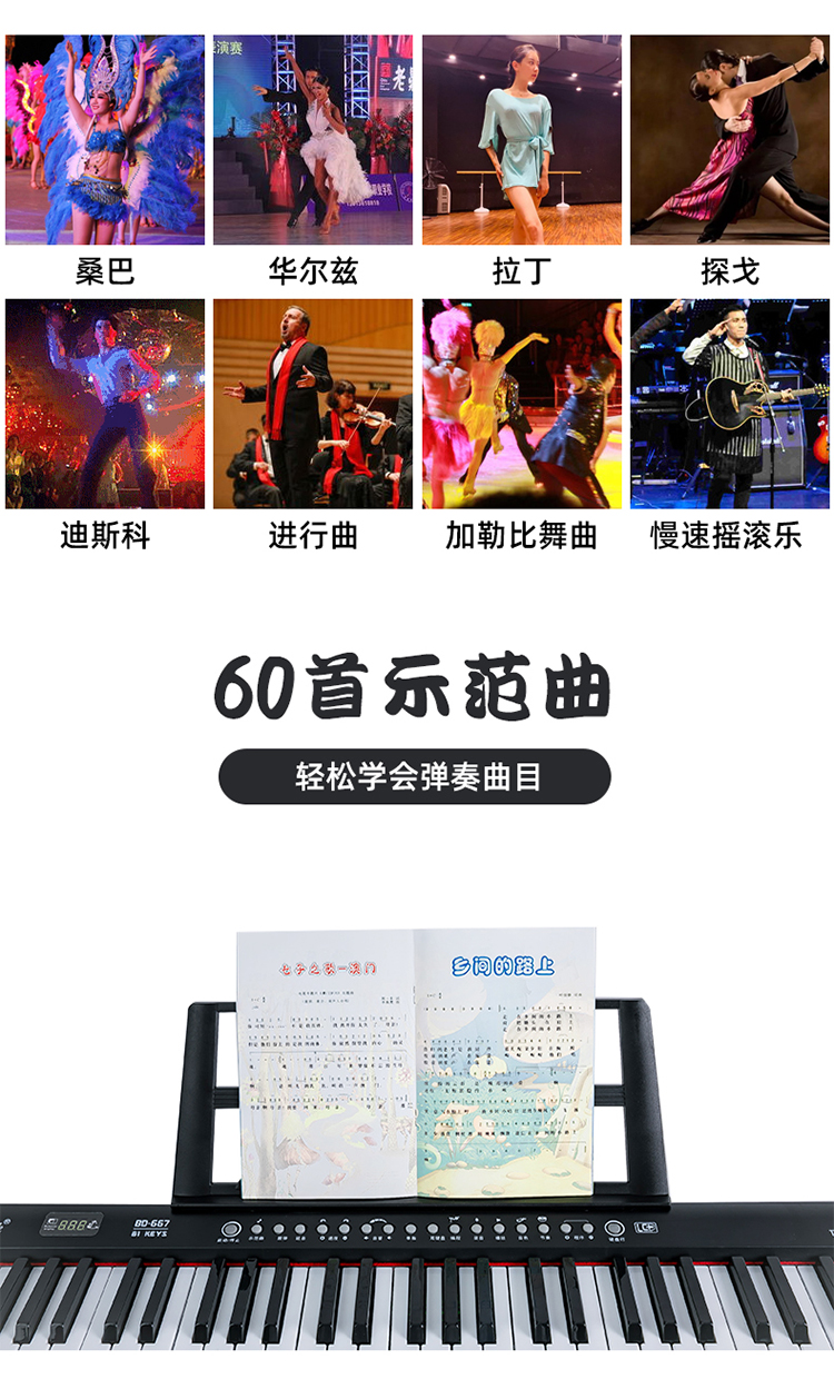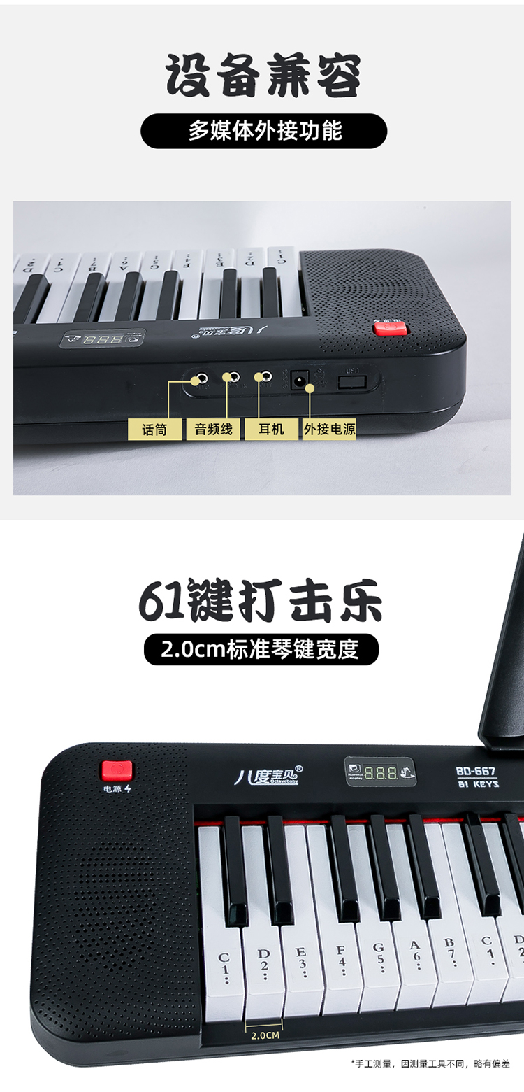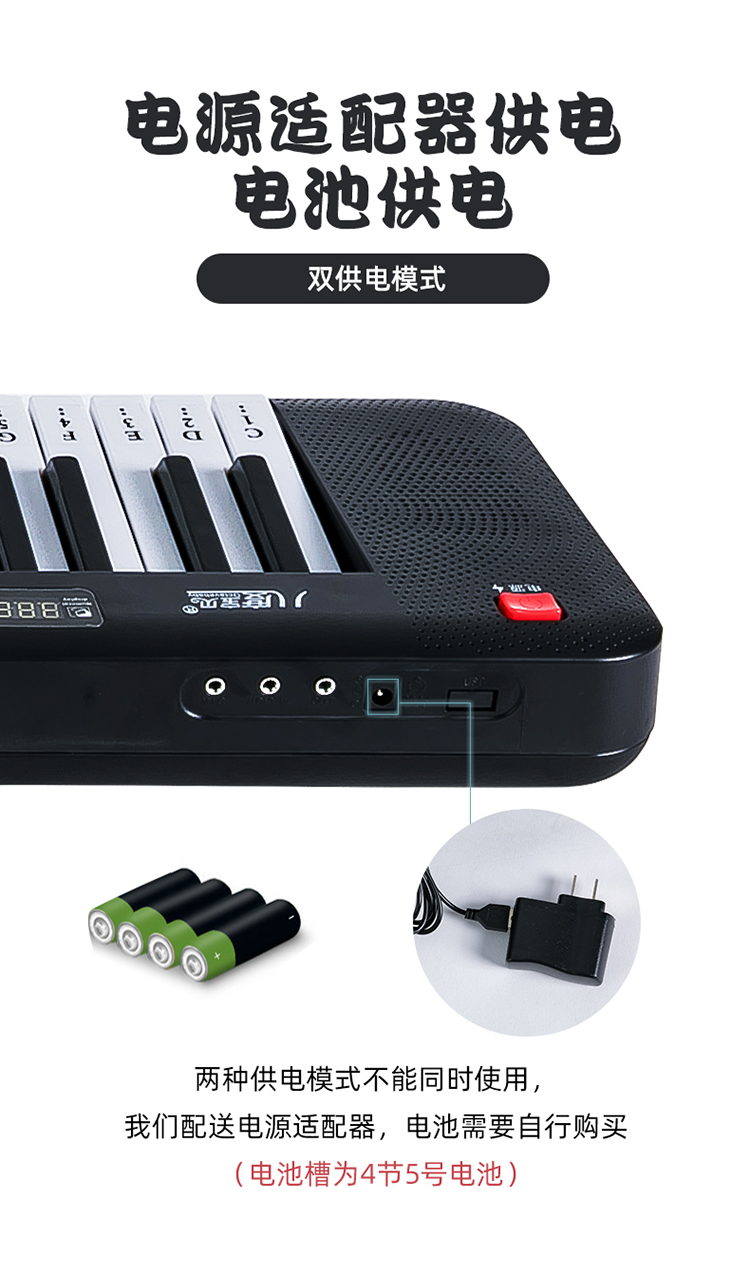 5V Power 60 Demo Songs 200 Rhythms 200 Tones Double Keyboard 3 Digital Display Audio input/output Battery available(4 AA batteries)