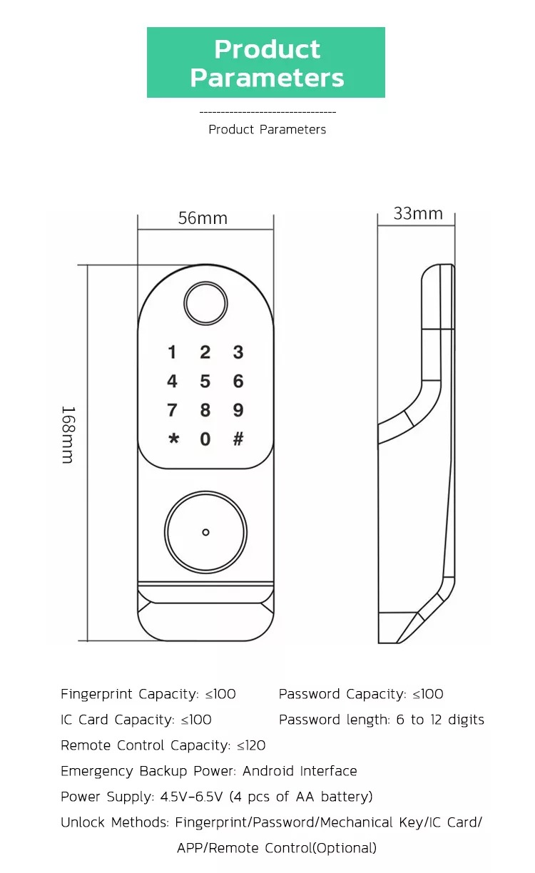 Fingerprint, Card, Pincode, Key,Optional for App or Remote conrtol