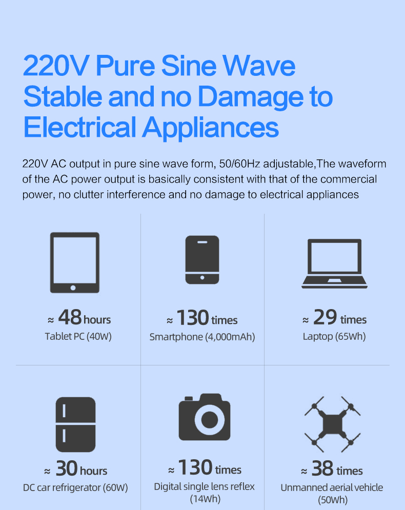 · 110V/230V pure sine wave AC output, 1996.8Wh super giant capacity lithium iron phosphate battery cell, durable endurance; · AC output 2000W high power, peak power up to 4000W, excellent performance is not anxious; · Support AC AC direct charging (1100W) and MPPT charging (500W), support dual simultaneous charging; · AC/DC/USB-C/USB-A/Car Filler/XT60 Six interfaces, up to 13 devices at the same time; · Twin handle design, easier to move, support emergency LED lights, camping picnic more convenient; · 9 rigorous tests, built-in active cooling system, with AC interface protection board, anti-false touch; · With LCD digital display large screen, clear partition of function panel, independent sub-control switch, safety and energy saving.