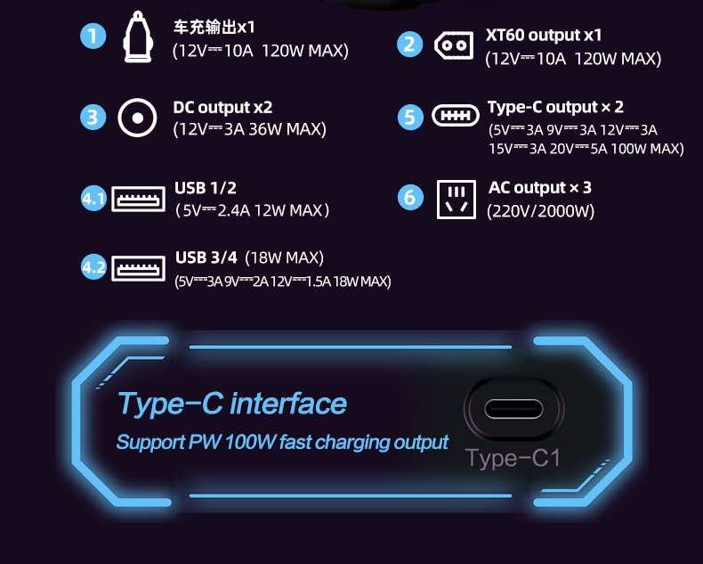 USB-C*2, Fast Charge*2, USB-A(12W)*2