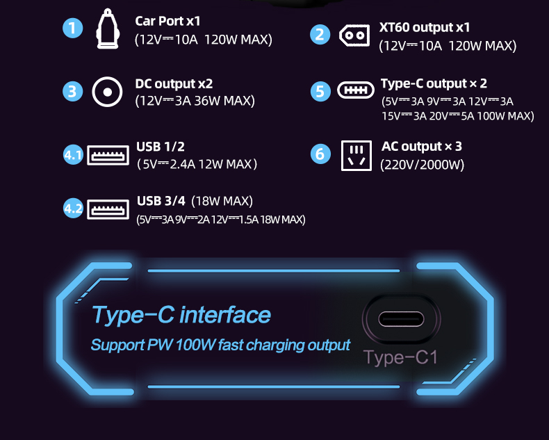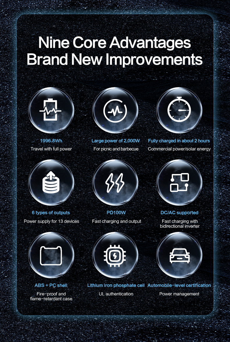 · 110V/230V pure sine wave AC output, 1996.8Wh super giant capacity lithium iron phosphate battery cell, durable endurance; · AC output 2000W high power, peak power up to 4000W, excellent performance is not anxious; · Support AC AC direct charging (1100W) and MPPT charging (500W), support dual simultaneous charging; · AC/DC/USB-C/USB-A/Car Filler/XT60 Six interfaces, up to 13 devices at the same time; · Twin handle design, easier to move, support emergency LED lights, camping picnic more convenient; · 9 rigorous tests, built-in active cooling system, with AC interface protection board, anti-false touch; · With LCD digital display large screen, clear partition of function panel, independent sub-control switch, safety and energy saving.