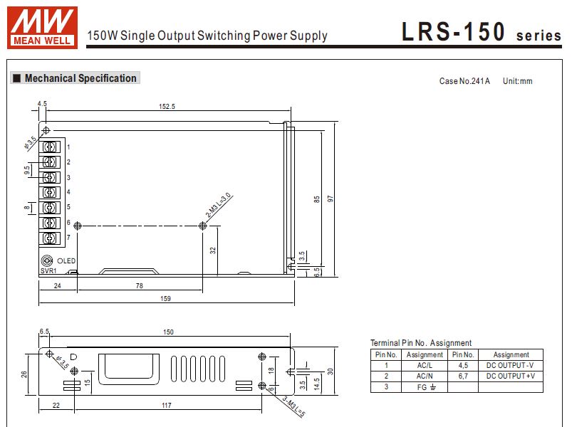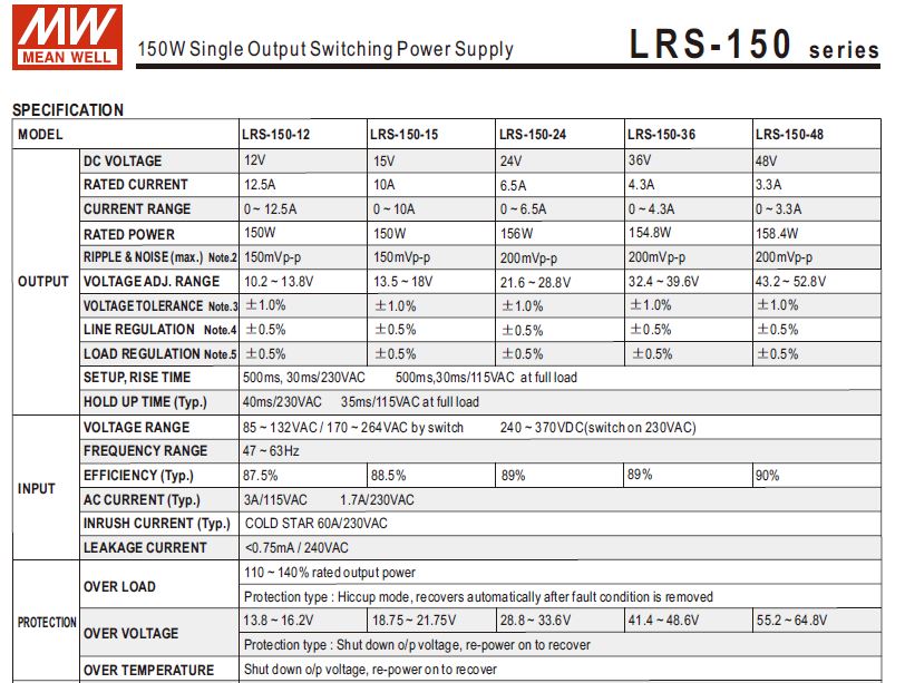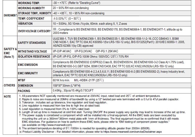>> What are the Specification Details of Meanwell Single Output Enclosed Power Supply LRS-150-24 ?