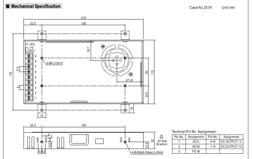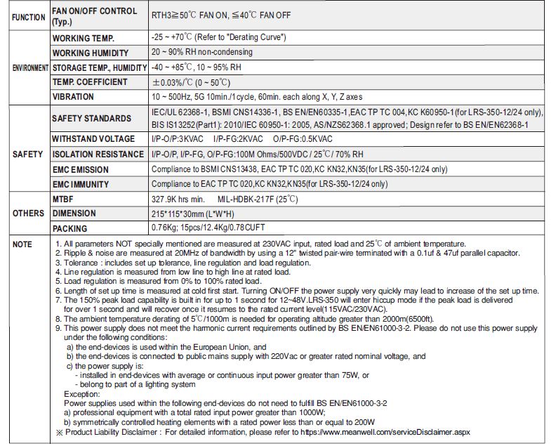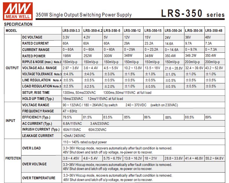 >> What are the Specification Details of Meanwell Single Output Enclosed Power Supply LRS-350-48 ?