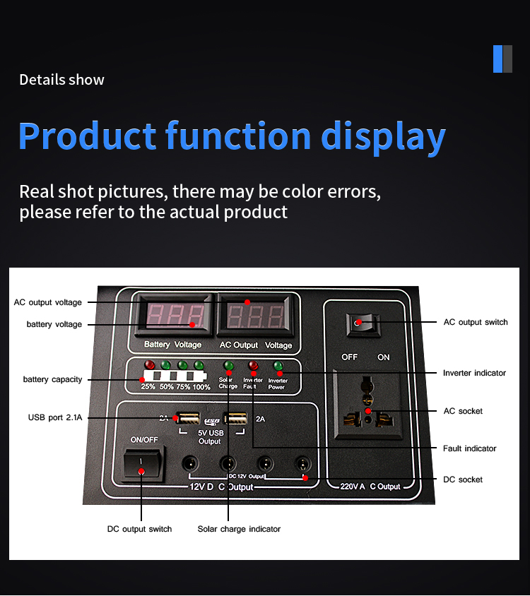 Portable solar system not only has solar power system function, but also has utility complementary function. When Mains power off,home portable solar energy system can switch automatically to take use off solar power from battery to run load. When solar power is not enough and power off, it can switch automatically to main power and connect with grid electricity take use of main power.At the same time charging battery. This is very suit for your home use.