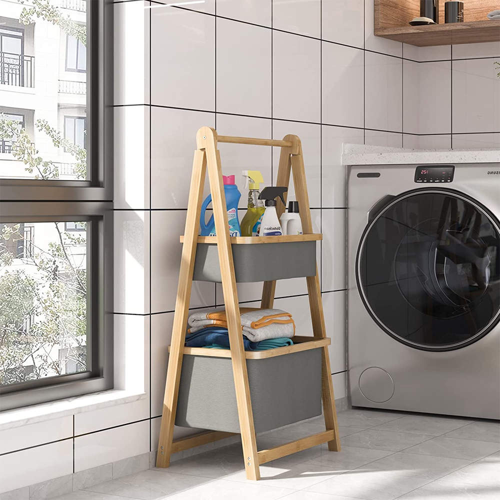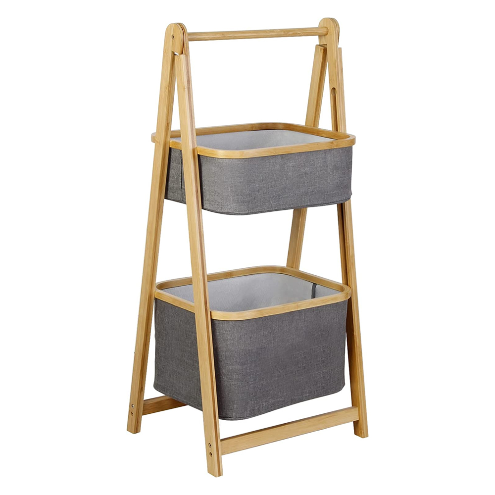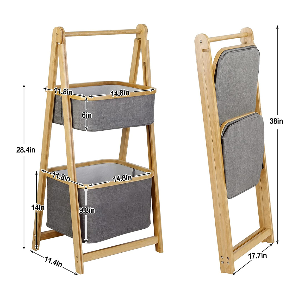 Two layer bamboo foldable laundry rack for simple storage and space saving storage basket