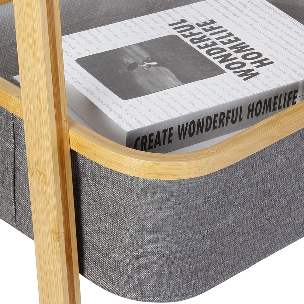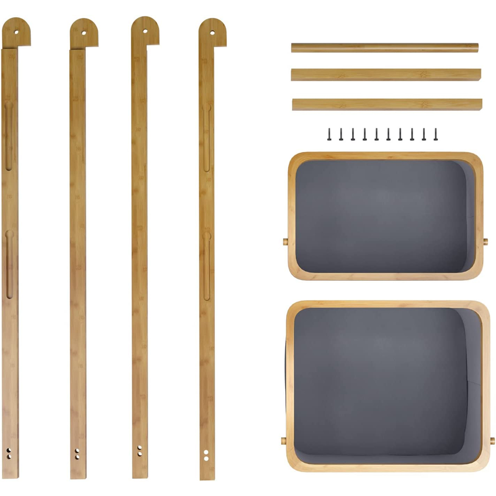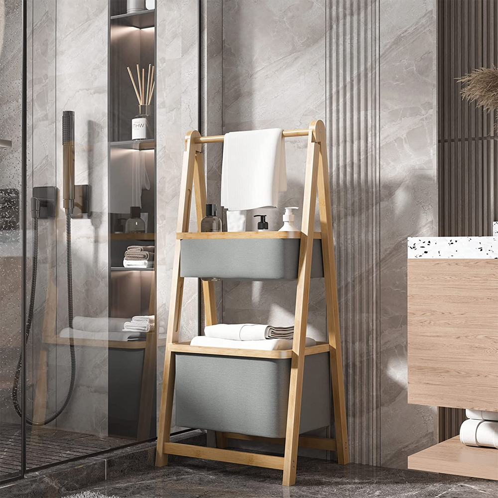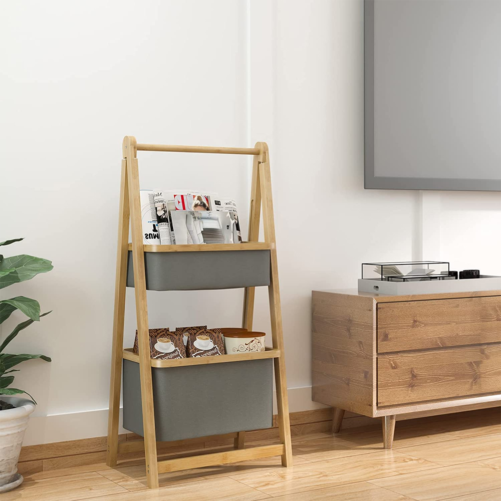 Two layer bamboo foldable laundry rack for simple storage and space saving storage basket