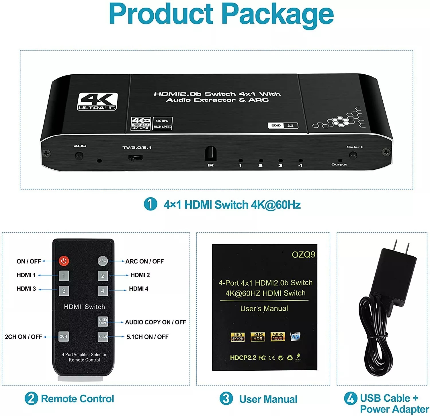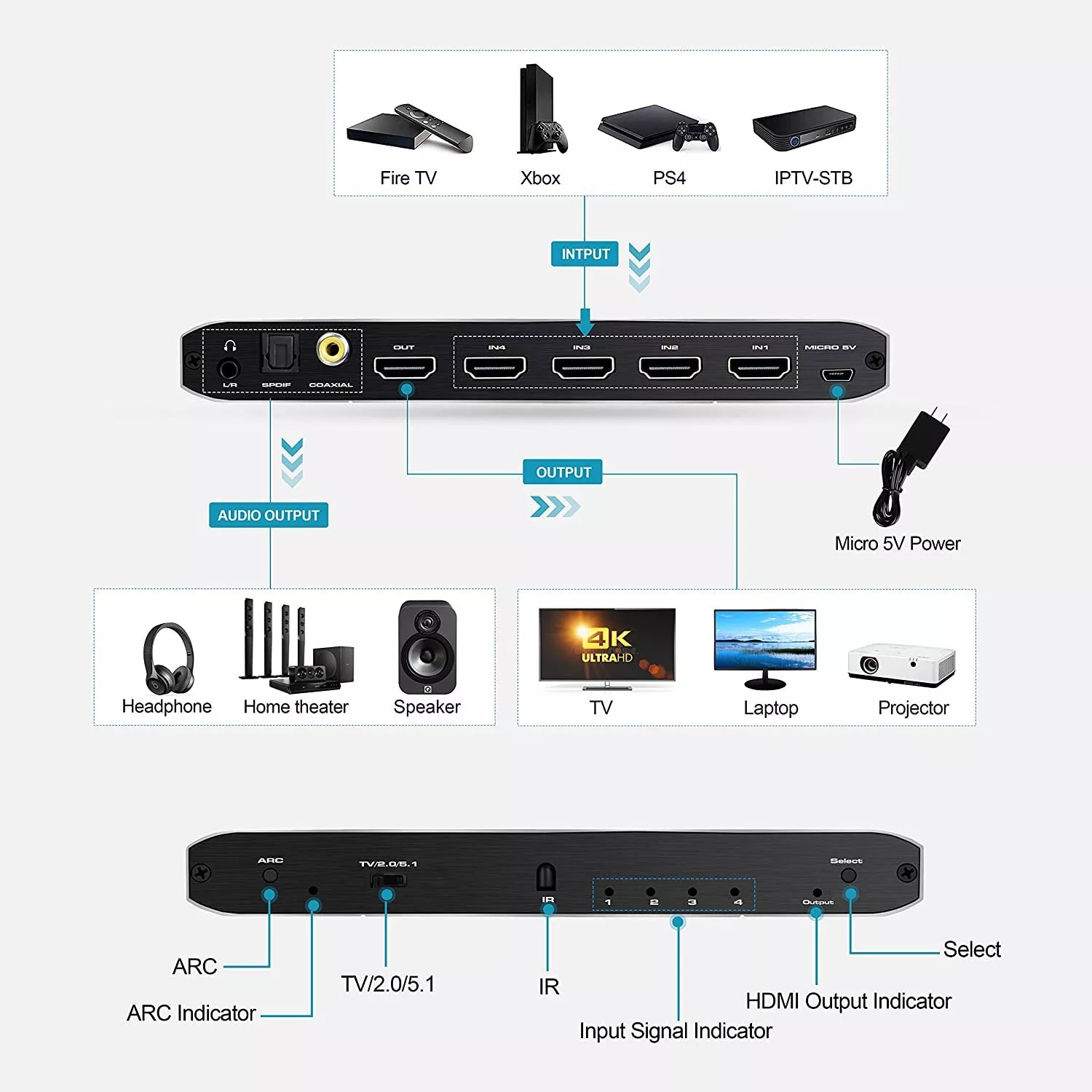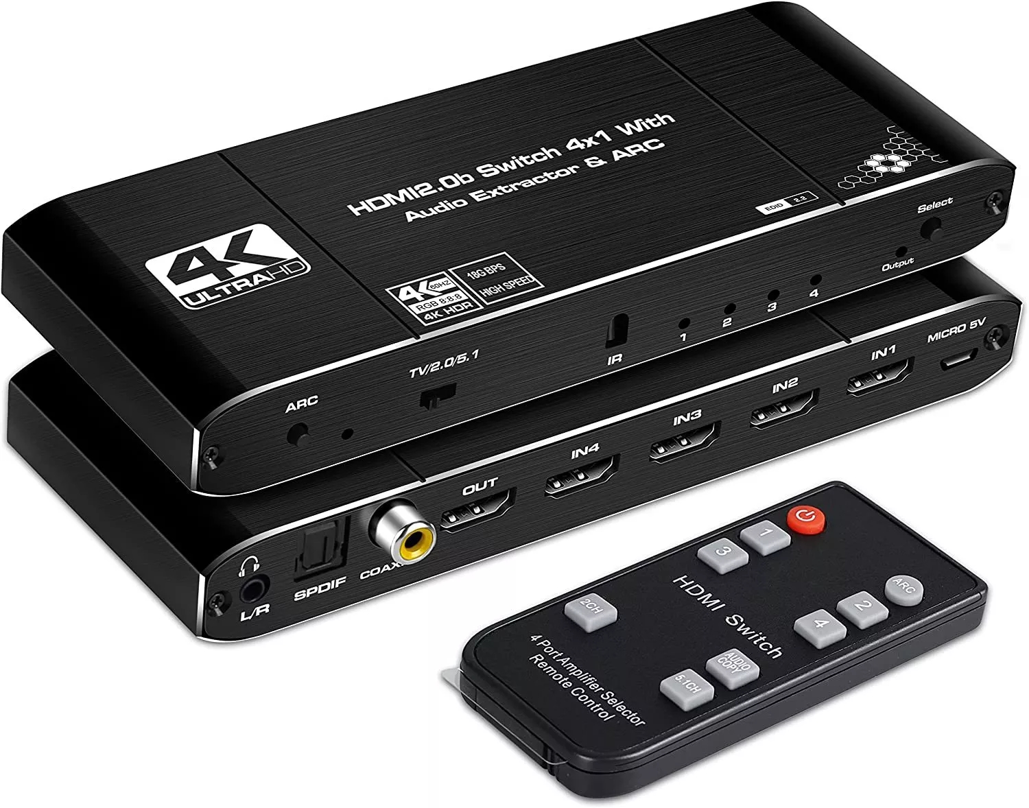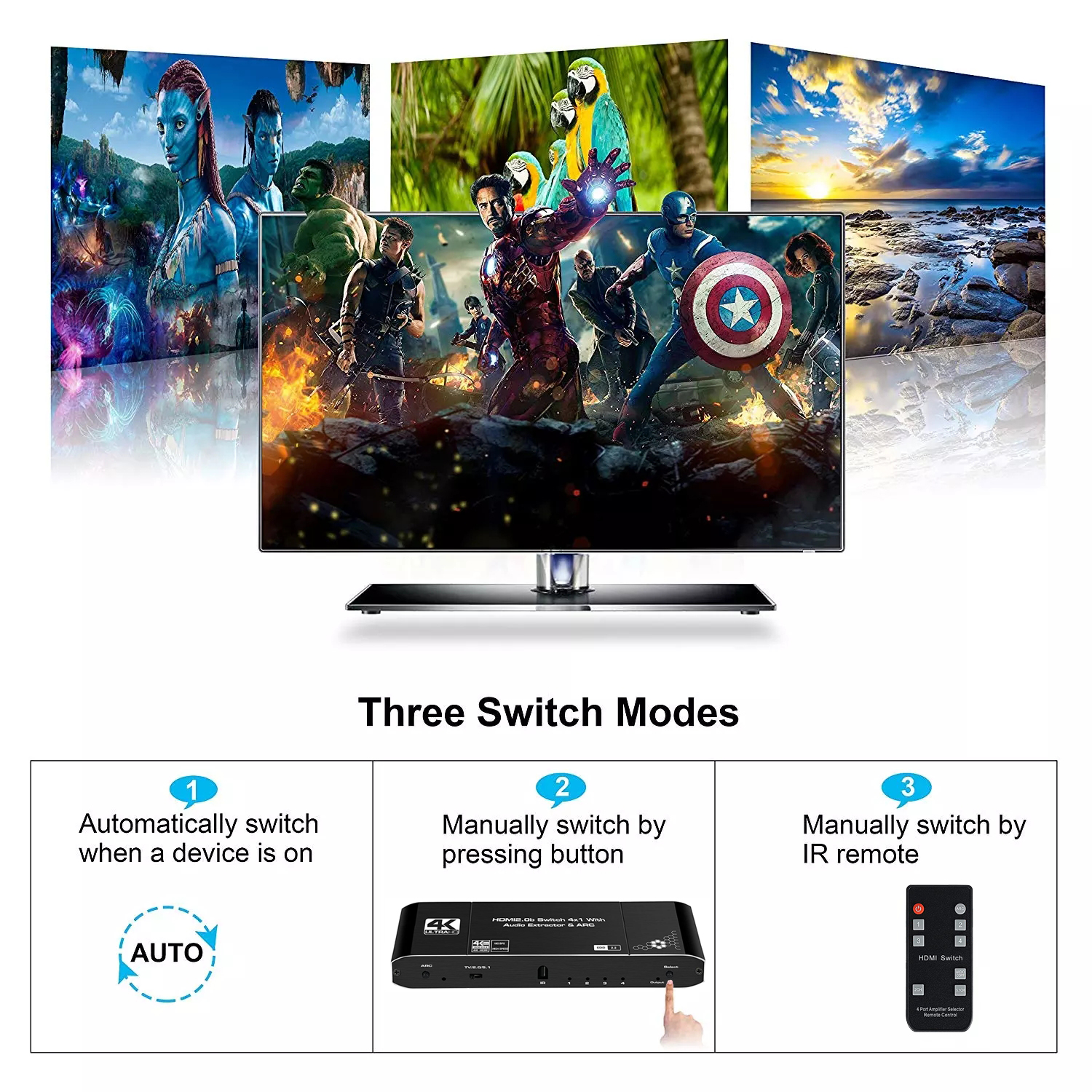 4K HDMI Switch Audio Output 4-port HDMI Switcher 2.0b 4x1 with ARC Coaxial Toslink 3.5mm with IR Remote Control Hdmi switch