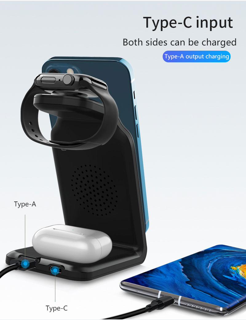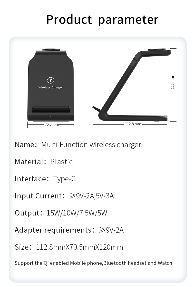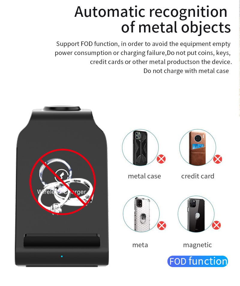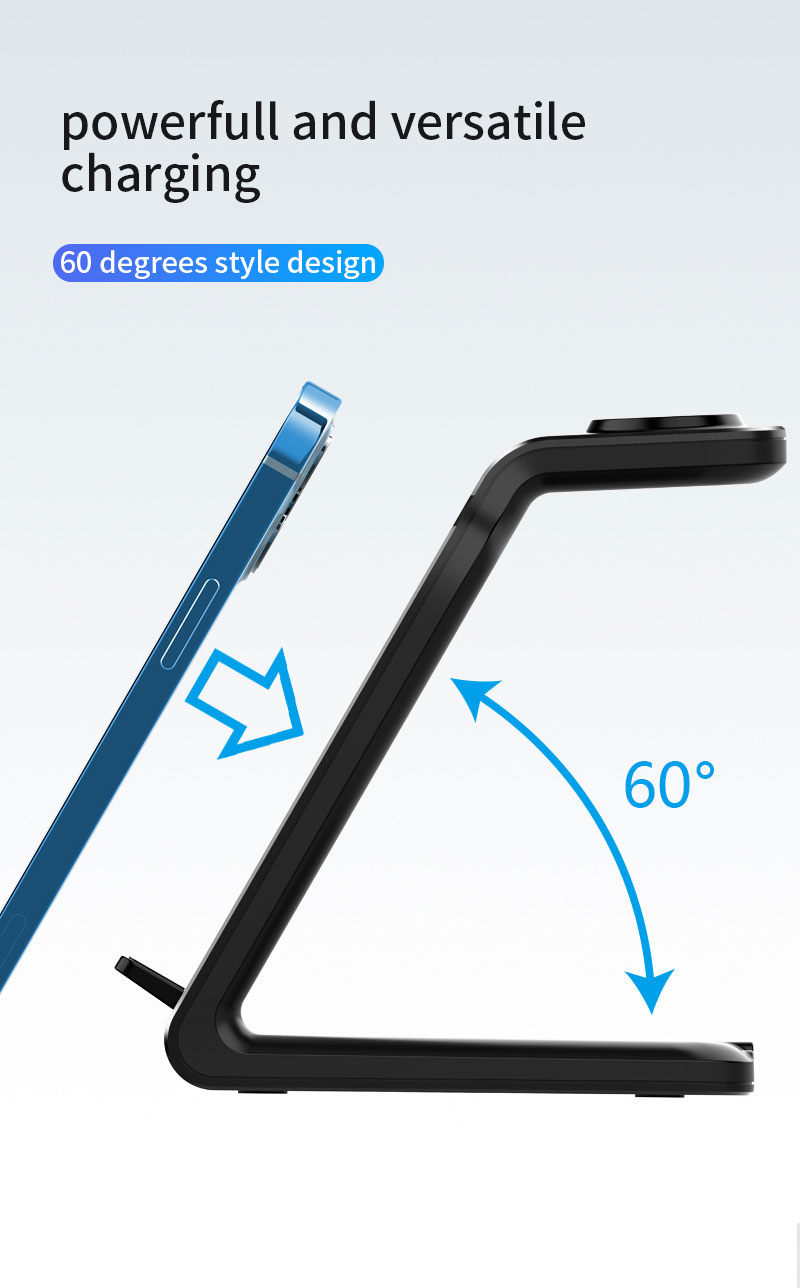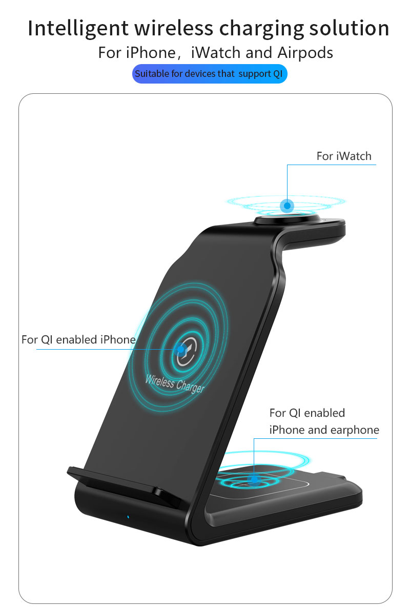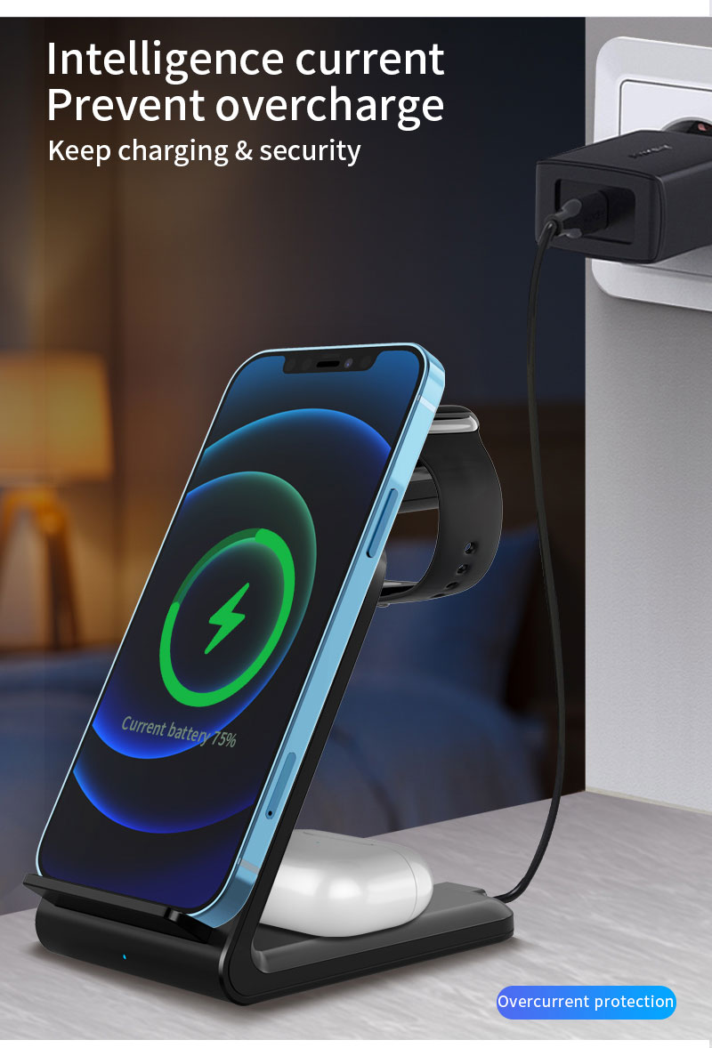 Multi-Protection: Approved by Qi, CE, FCC, & ROHS. This Qi wireless charger stand comes with built-in temperature control, voltage protection, & automatic shut-off in addition to foreign object detection. A silicone-coated cover makes the charger electrostatic-proof & smooth to the touch.Save Space: Tired of multiple cords? Our iPhone charging station requires a single cable and QC 3.0 adapter thereby saving valuable space on your desk.Charging Indicating: Just a glimpse, and you will know whether your phone/watch/buds are charging. LED lights on the base will give a clear charging indication