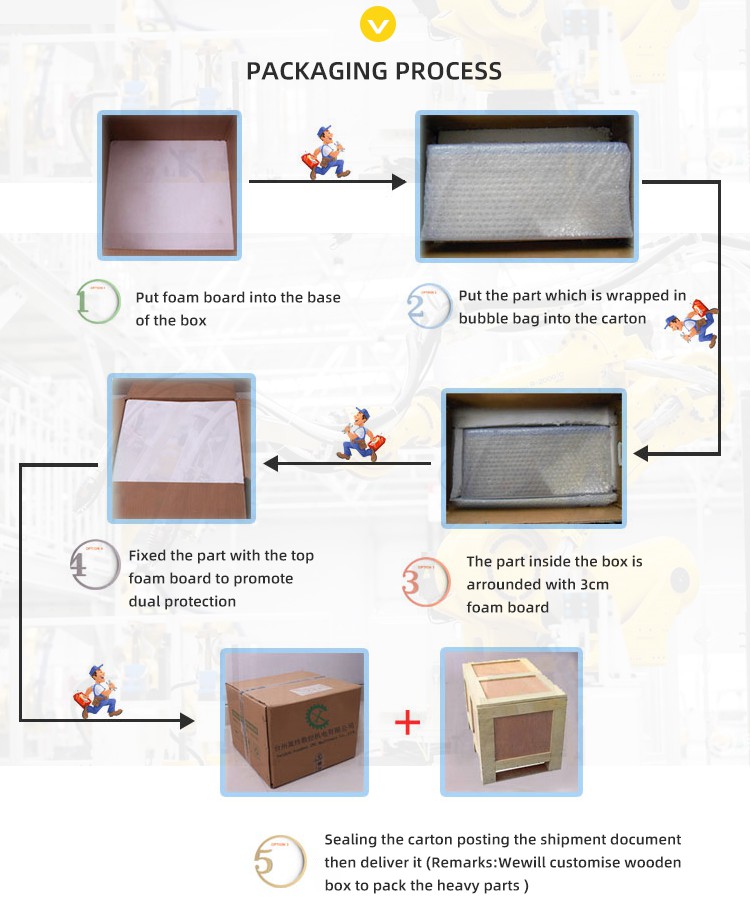 We usually use foam board with 3 cm thick to fill in all around the box inside to protect parts. We often use carton to pack the parts, but if they are too heavy, we will customized the wooden box for them