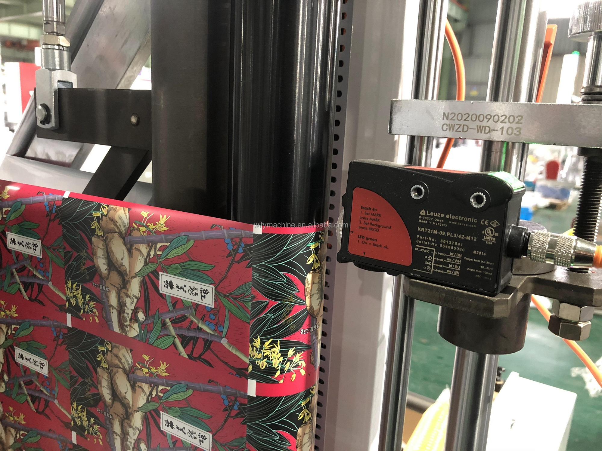 Three servo motor for traction from JAPA PLC adopts Panasonic from Japan; Touch Screen from Taiwan Main driving is alternating current with Yaskawa from JAPAN inverter, automatic constant tension for unwinding. Thermal-sealing knife’s quantity of heat: 1. Vertical-sealing for zipper adopts 1 group for heating fluctuation, 2. Vertical-sealing for side sealing adopt 5groups for heating fluctuation, cooling fluctuation from up and down 3. Zipper flattening adopt 2 groups heating. 4. Bottom sealing adopts 3 group heating, 1 group for cooling