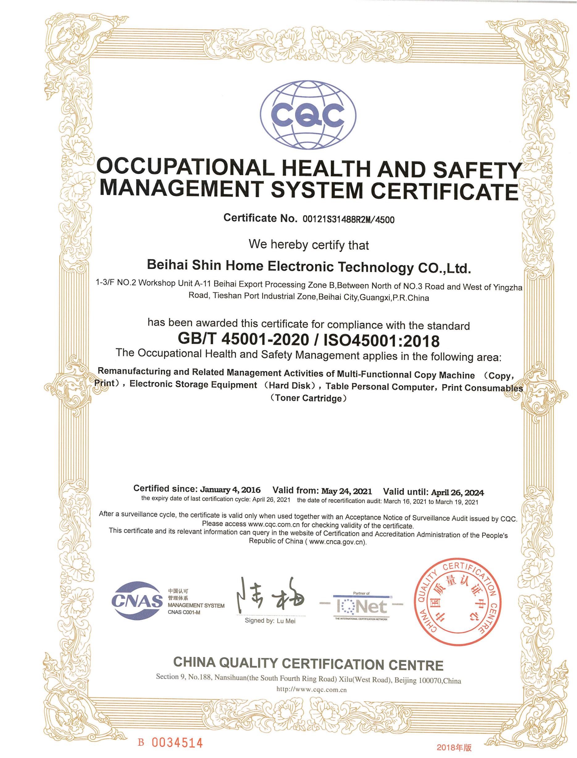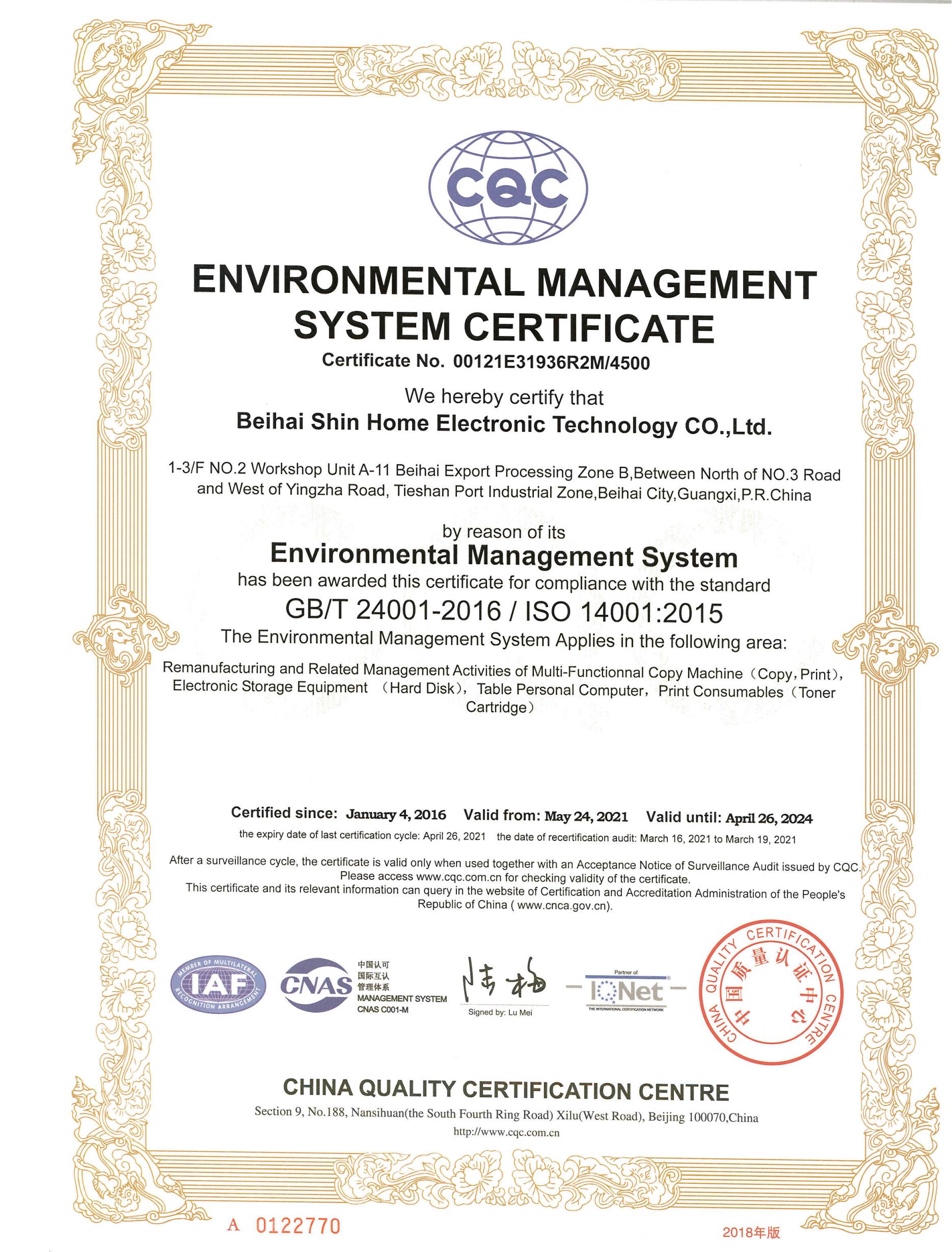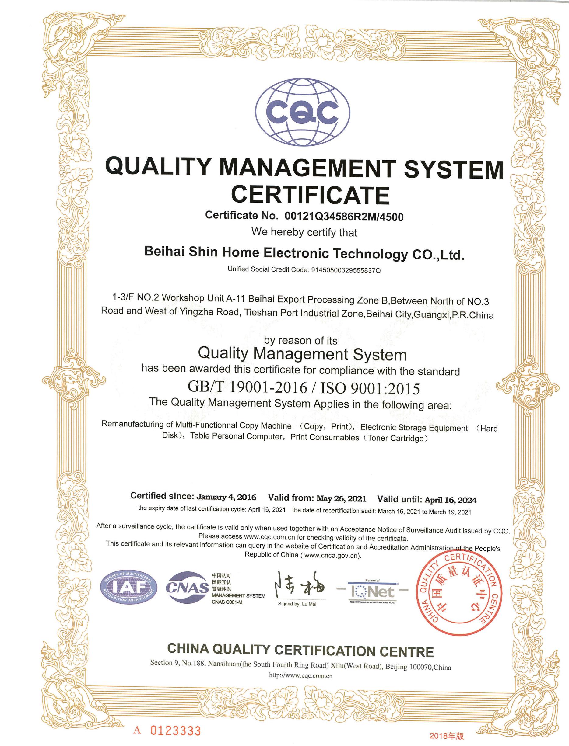 Founded in May 2015, Beihai Shin Home Electronic Technology Co., Ltd. is a technology limited liability company integrating the maintenance and remanufacturing of engineering copiers, printers, toner cartridges, ink cartridges and office equipment. The company is located in Zone B of Beihai Export Processing Zone, "Beihai National High tech Product Global Entry Maintenance/Remanufacturing Demonstration Zone", with 20000 square meters of production and office space. The company has been designated by Guangxi Entry Exit Inspection and Quarantine Bureau as a pilot enterprise for the import and remanufacturing of used mechanical and electrical materials. The company has prepared the enterprise standard Technical Requirements for Digital Multifunctional Black white Electrostatic Remanufacture Copiers and Printers (Q/SH001-2015); Participated in the formulation of the national standard General Specification for Remanufacture of Waste Copiers, Printers and Quick Printers (GB/T34686-2017); The company has obtained ISO9001:2008 Quality Management System Certification, ISO14001:2004 Environmental Management System Certification and OHSAS18001:2007 Occupational Health and Safety Management System Certification; The company has its own enterprise trademark and a number of proprietary intellectual property rights.