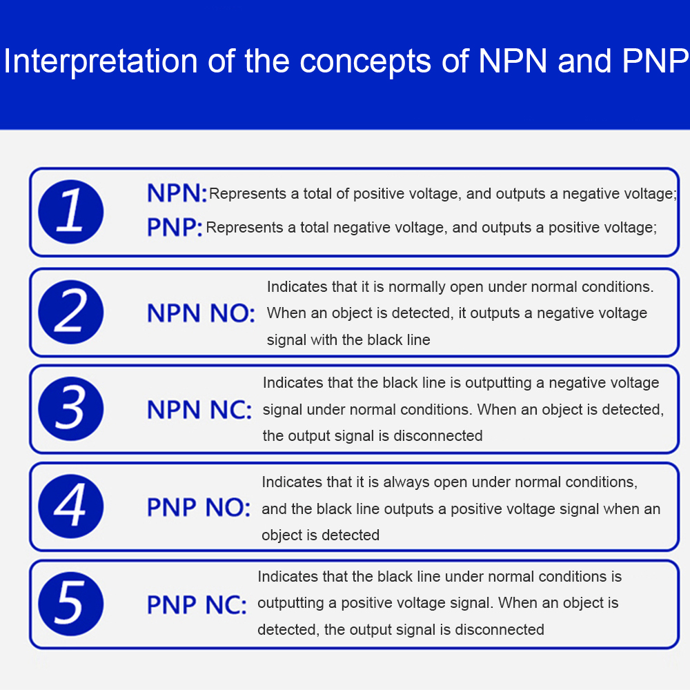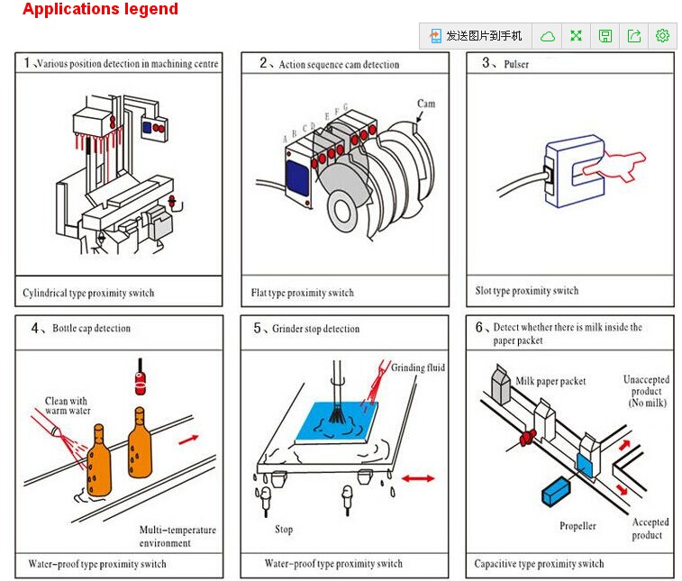 Proximity switch is a mechanical moving parts and without direct contact with the position of the switch can be operated when the object approaches the sensing face switches to operating distance, without any mechanical contact and exert pressure to make the switching operation, thereby driving the DC electrical or to a computer device provides control commands. It is a component widely used in automatic control industry for detecting, controlling, and noncontact switching. When proximity switch is close to some target object, it will send out control signal. It's widely used in machine, paper making, light industry for limiting station, orientation taking count, speeding trial ect. Note: 1.The Optimum voltage range is DC 6-36V. 2.It is recommended that the actual detection distance is less than 70% of the detection distance on the name plate. 3.When wiring, do not energized, strictly according to the wiring diagram. 4.only metal objects can be detected, especially for iron metal can be better detected, but the choice of non-iron metal, the detection distance will be greatly reduced.