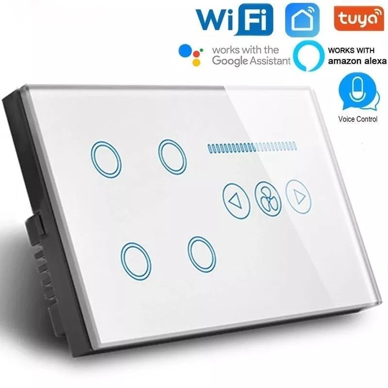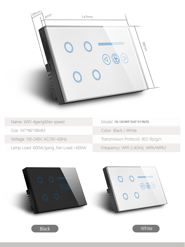 Smart Wifi 4 Gang&Fan Speed Switch 1. App Control –Control switches from anywhere with your smartphone.(Smart Life TUYA) 2. Voice Control –Works perfectly with Amazon Alexa, Google Home 3. Timing–Set scheduled/countdown timers to turn on/off at specified time 4. Share Control– Control your smart home together with your family 5. High quality crystal tempered glass panel design,never fade 6. With red and blue LED indicator,very distinguished 7. Easy to install,Neutral wire required 8. Status indication and Power statistics function 9. only support the Fan can be stepless speed regulation