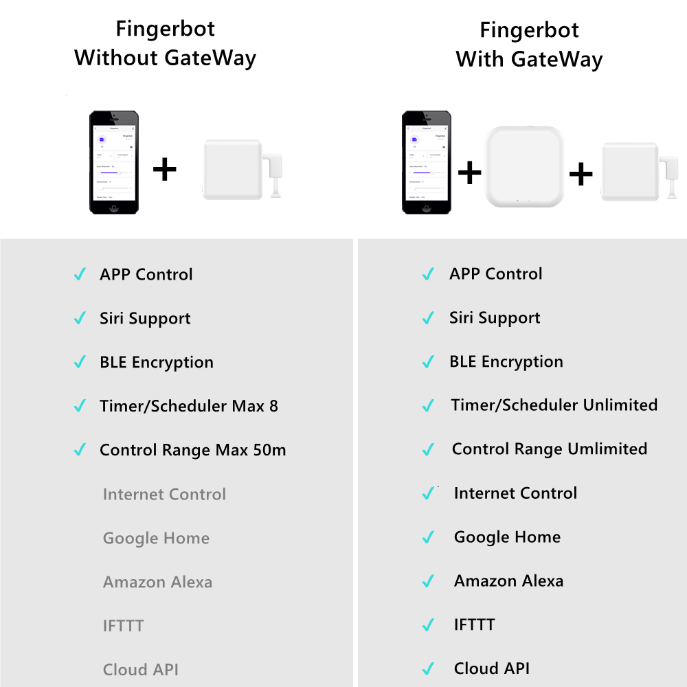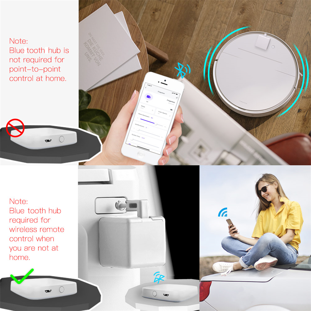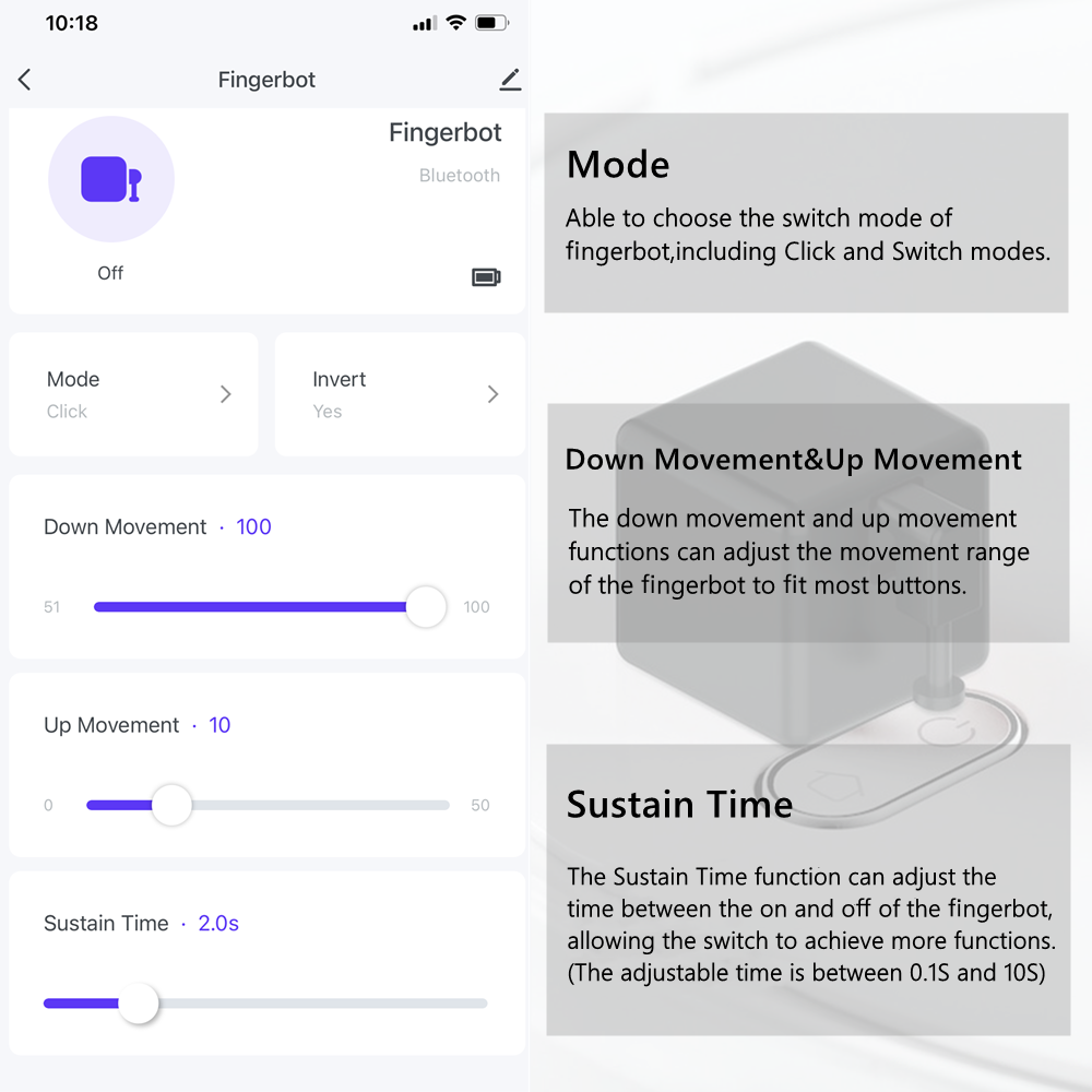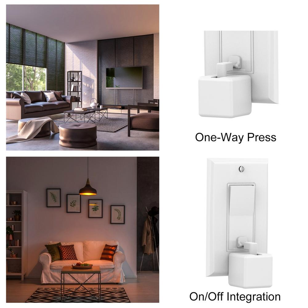 1.Smart BLE Fingerbot is designed for transforming your house traditional switches and buttons into smart ones by simple click with the bot button pusher;built-in Tuya chip enables smart operations in Smart Life App for intelligent controls no matter where you are; Battery powered, eliminating the trouble of charging. 2.Extremely simple pairing mode into Tuya Smart Life App with your phone BLE on and 2.4G WiFi connected for this BLE version,no hub required for accessing multiple intelligent functions and features in App.Up and down optional movement with 0-100 adjustable to meet your own demand on concrete devices; even featured as sustain time set for added convenience. 3.Smartly control your traditional appliances via voice command by Alexa and Google Assistant,activating vacuum with voice, and remotely power on your office PC or house traditional appliances with switch or button design with no effort. Enjoy an effortless smart lifestyle with this smart Fingerbot ;Timer your own schedule for specific devices to turn on/off at a preset time in App;device share to your family members and group control are both available in App with a simple tap. 4.Fingerbot is compatible with various buttons and switches. It can simply stick to any surface and retrofit your old appliance.If you have installed it in the opposite direction,no more worry about this,there in App the invert switch option available to adjust its position anywhere you are,ensuring your life with time saving and energy saving for real-time battery level monitoring.You can use the Fingerbot for your lights, fans, coffee makers, garage door, and more. With the add-on, a rocker switch could be flipped at both directions, push or pull for ON/OFF by only one Fingerbot. 5.Its modular design allows users to replace Fingerbot's arm with various tool pack options of Fingerbot for extending its capability in various cases. All you need is to tape the Fingerbot right next to a rocker switch or button with a stripe of the sticker. No swapping, no tools are required. The provided 3M sticker allows you to install your Fingerbot wherever you like;A hassle-free safe DIY journey you'll experience from now on;only supports 2.4G network;includes full 2-year warranty and 60 -day refund guarantee for complete satisfaction. 6.Down Movement&Up Movement The down movement and up movement functions can adjust the movement range of the fingerbot to fit most buttons. 7.Sustain Time The Sustain Time function can adjust the time between the on and off of the fingerbot, allowing the switch to achieve more functions. (The adjustable time is between 0.1S and 10S)