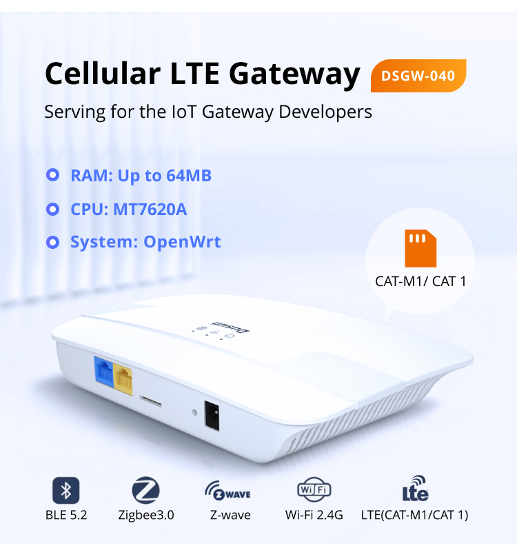 The DSGW-040 Cellular LTE Gateway is secure and programmable Iot Gateway designed for the IoT Gateway Developer and provides cellular connectivity to the cloud. The smart gateway allows the developers to build the custom firmware from the buttom layer of the hardware with preintegrated, comprehensive, and fully documented out-of-the-box guidance and support.