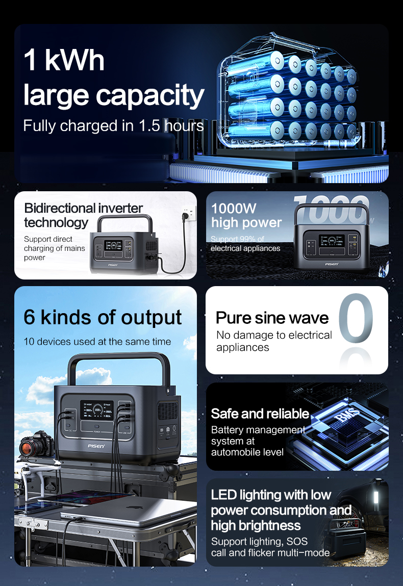PISEN Super Fast Charging Portable Power Station 1000W 1008Wh Lithium Battery Tragbares Kraftwerk Solar EU Plug