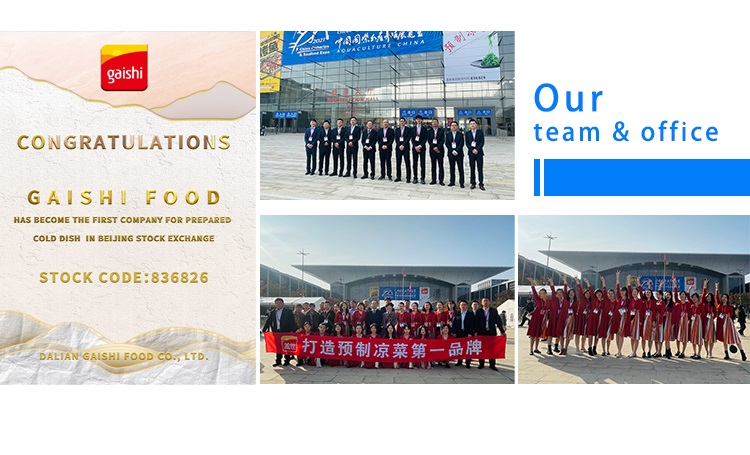 Registered Capital: 88.55 million Invention Patent: 10 Employee: over 300 Plant Area: 25,000 m² Production Capacity: over 10,000 tons Cold Storage Area: 3,000 m² Cold Storage Capacity: over 2,000 tons Main Brands: “Gaishi” “SHAN QUAN ZHU” “JI XIAN FENG” “HAI WEI GUAN” “SHAN ZHEN YUAN” “YI PIN ZANG YU” Main Production Equipment: Japanese Automatic Weighing Machine, Automatic Seaweed Salad Production Line, Automatic King Oyster Mushroom Salad Production Line, Automatic Quick Frozen Production Line. Fully Owned Subsidiaries: Dalian Enjoy Co., Ltd. Dalian Gaishi Shunda Seafood Co., Ltd. was established in 2019, and owns marine pastures.