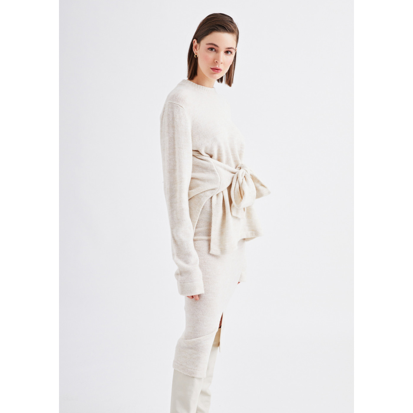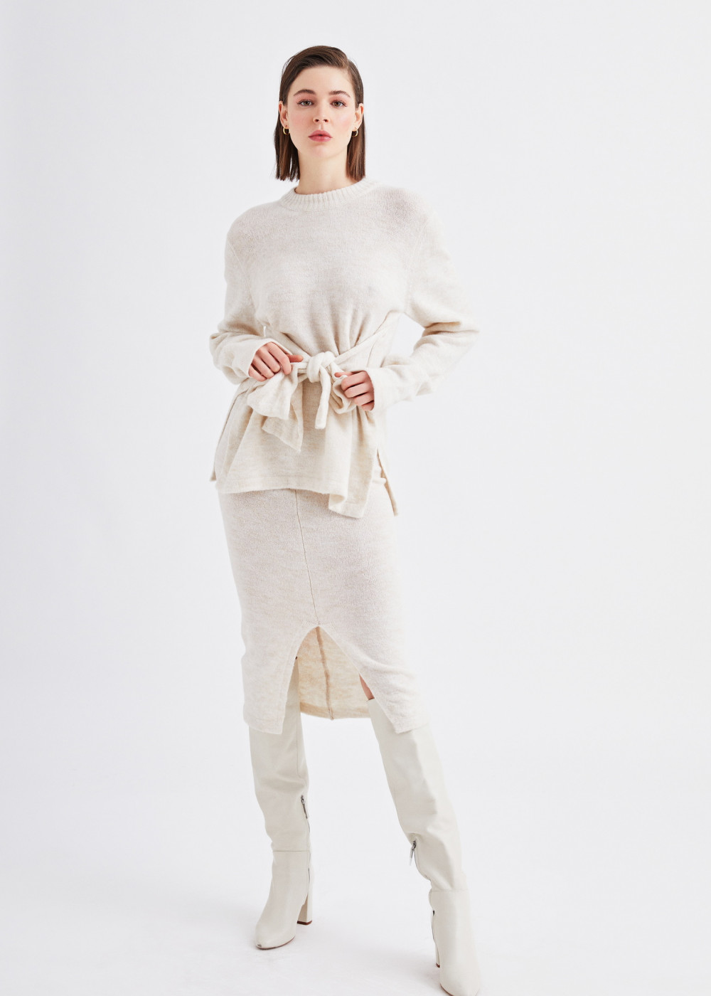 Zero-collar, long-sleeved, front-bound knitwear sweater. A pencil skirt with a tear.