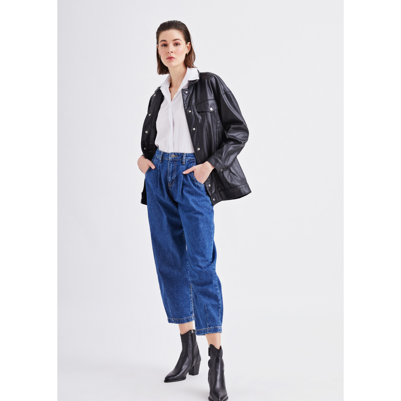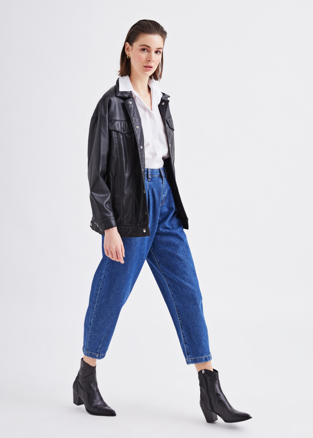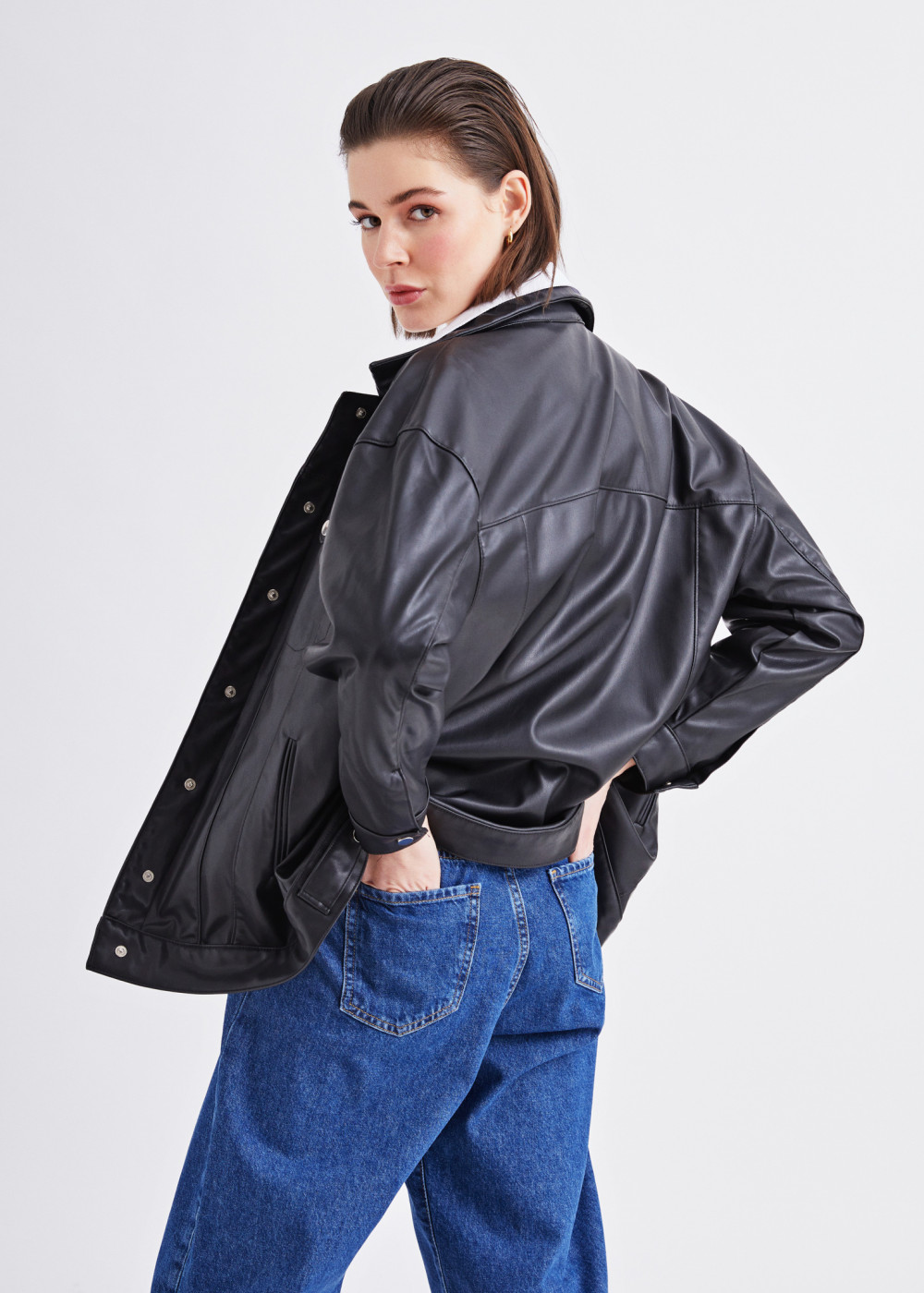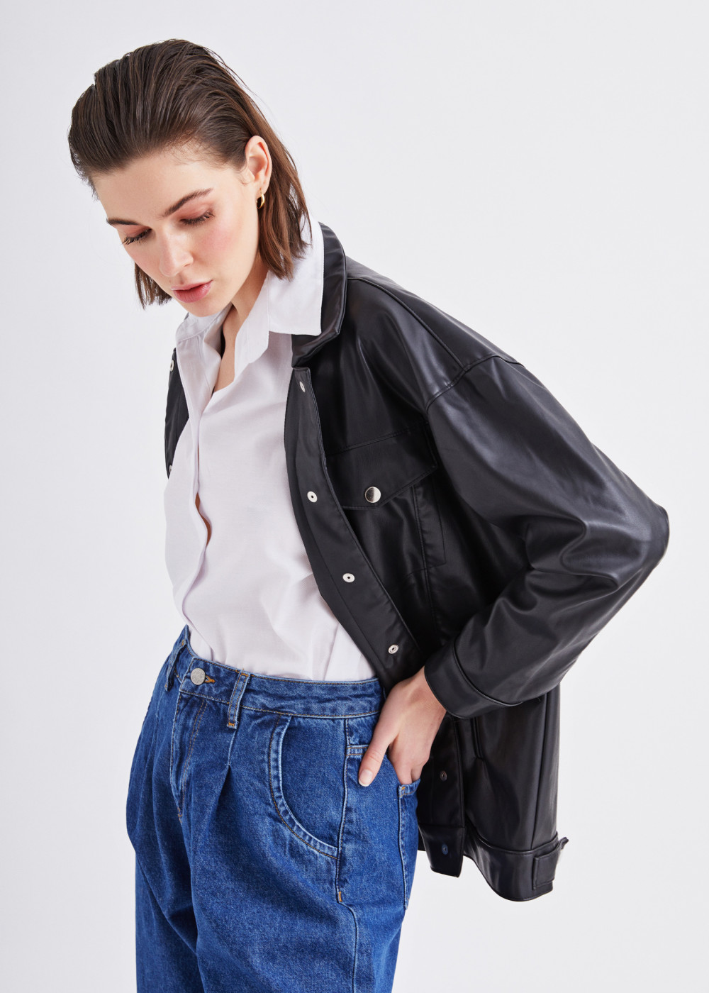 Shirt collar, front buttoned, metal studs detailed leather jacket.