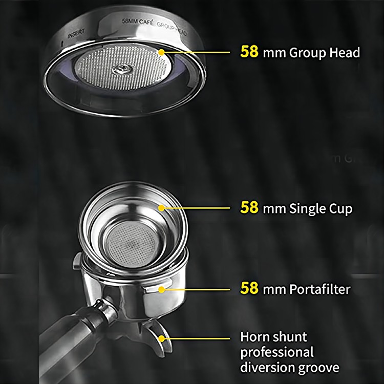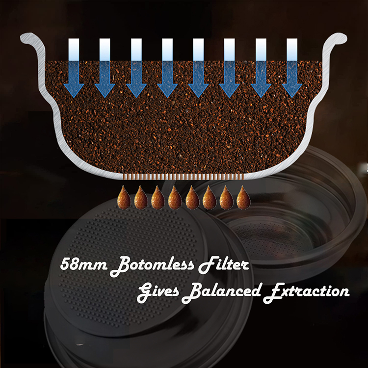 - 58mm filter hold 18~22g coffee powder, bottomless enables full extraction.