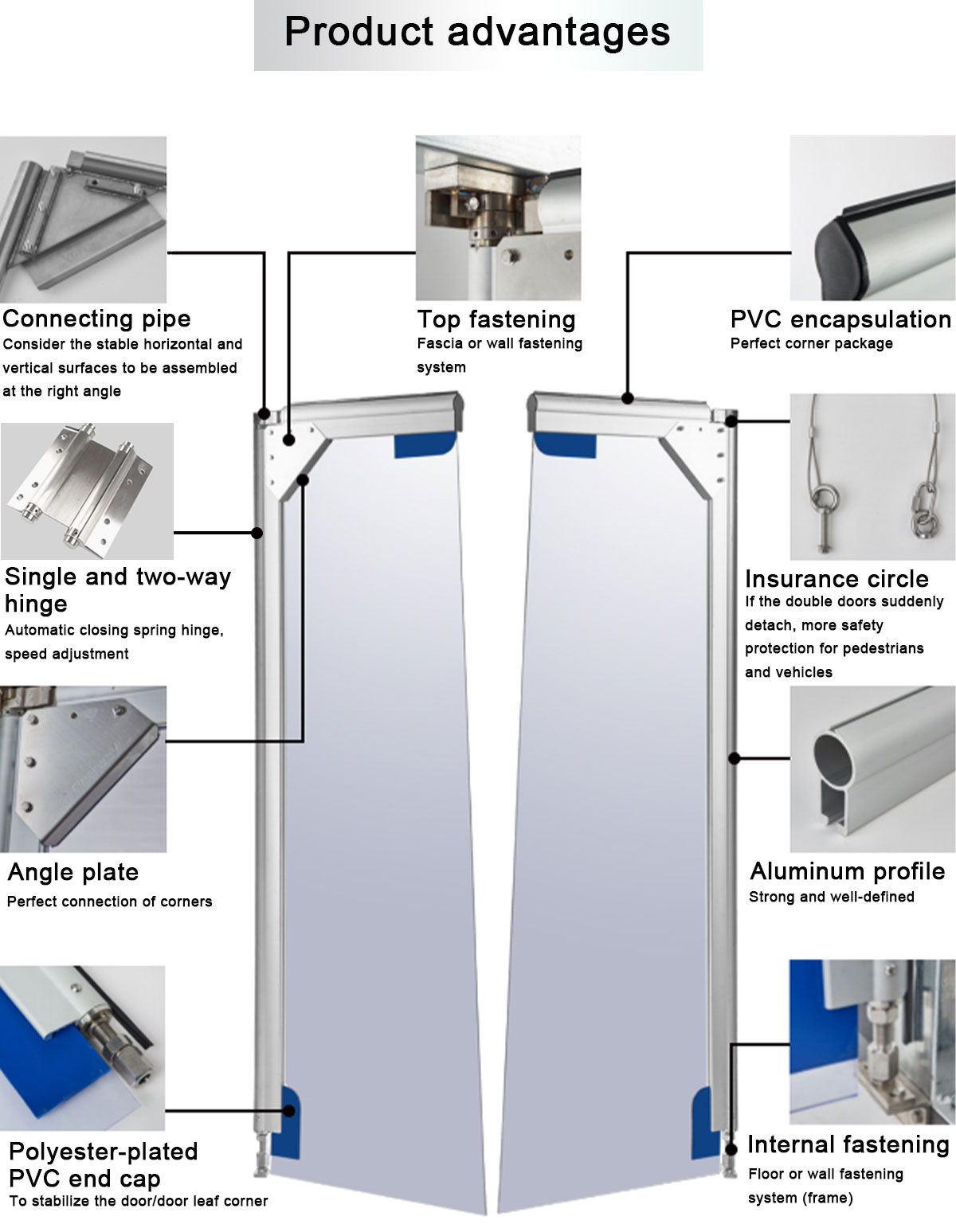 Swing doors . also known as PVC light doorsProduct size : 810mm-1020mmOptional PVC thickness : 2 / 7mmPVC light-installed door products are suitable for restaurantaisles and workshops door openings , home door Openingsetc