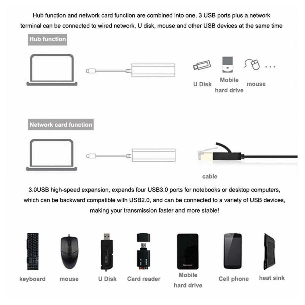 5.Design, mini size 6. Output port interface: - Function 1: 3-port USB 3.0 HUB hub, backward compatible with USB 2.0/1.2/1.0. -